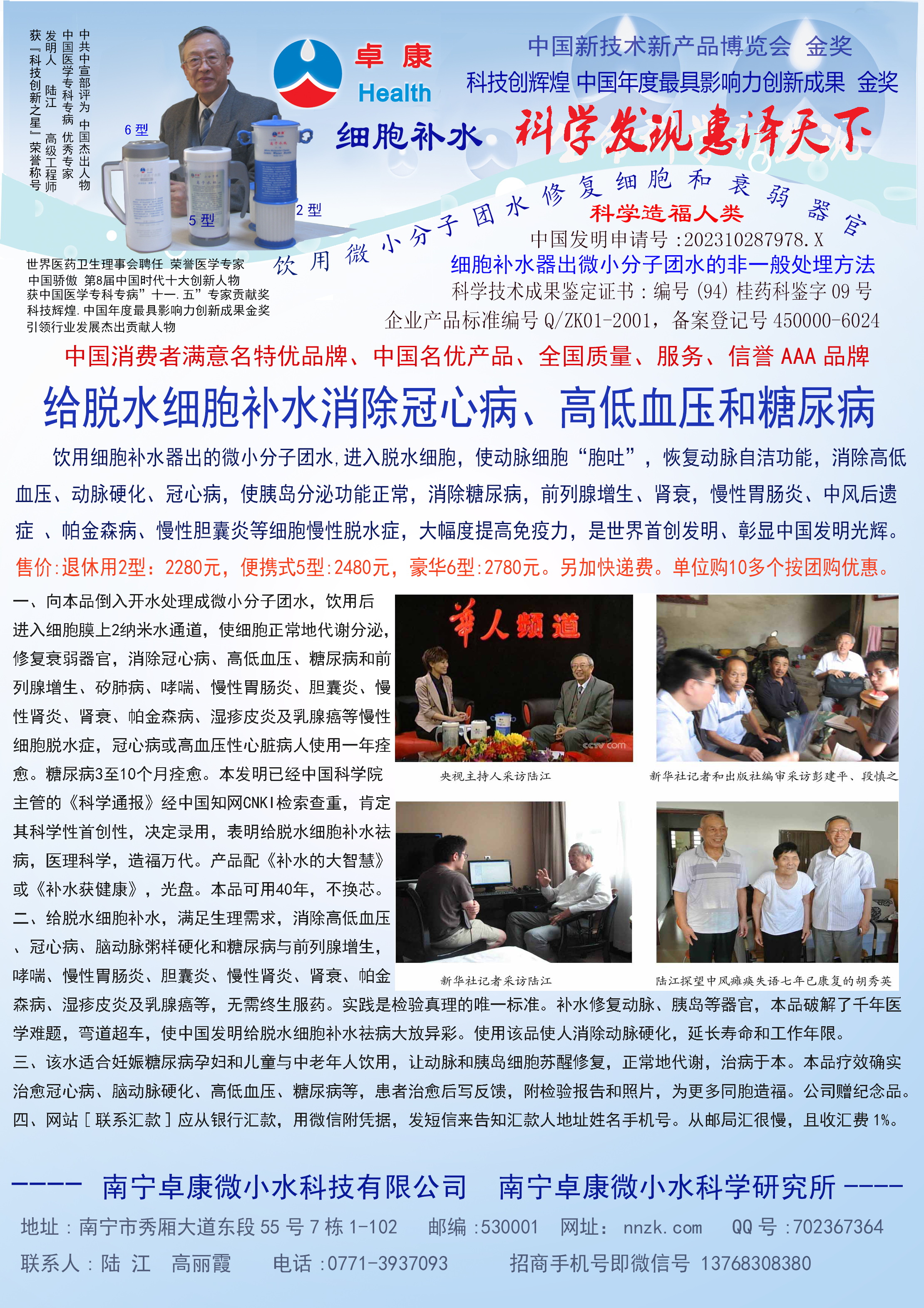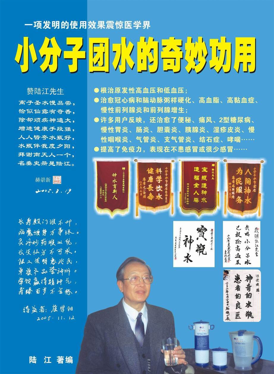 人類幾千年來患以上病癥需終生服藥,幾十年也不能治愈。可是我國南寧的高級工程師陸 江,于1990年想根治高血壓,研究發明了離子水瓶,處理出微小分子團水供飲用,經過醫院臨床試用和專家鑒定,1999年獲中國發明專利權,產品于2000年投放市場后一直跟蹤調查,據全國各地用戶反饋:祛除了高低血壓、糖尿病和冠心病,并使前列腺增生、咽喉炎、鼻竇炎、慢性氣管炎、支氣管炎、矽肺病、哮喘、慢性胃炎、腸炎、慢性膽囊炎、慢性腎炎、腎衰、膀胱炎、便秘、痔瘡、風濕性關節炎和濕疹皮炎及中風后遺癥等病癥不藥而愈。為什么喝微小水能治20多種病?陸 江從1991年德國科學家發現細胞膜水通道僅為2納米獲得啟發,認為多種器官患病是因細胞脫水,不能正常代謝和分裂增殖,才使器官細胞減少致衰弱萎縮而形成細胞缺水性病癥。22年來的實踐有力地支持了“細胞脫水致病”這一重要論點,表明喝微小水可滿足細胞的生理需求,補水就能祛病,是生命科學新亮點。